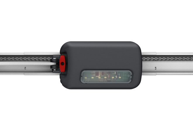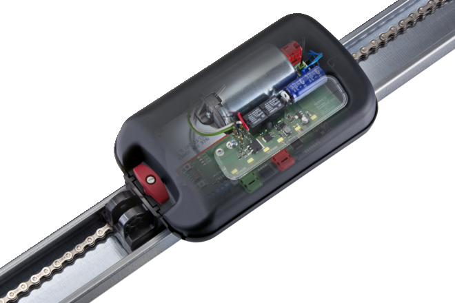 Bei dem Garagentorantrieb SOMMER base+ ist das Steuerungsgehäuse am Ende der Laufschiene fest verbaut. Mit dem SOMMER pro+ kann das Steuerungsgehäuse separat montiert werden.
