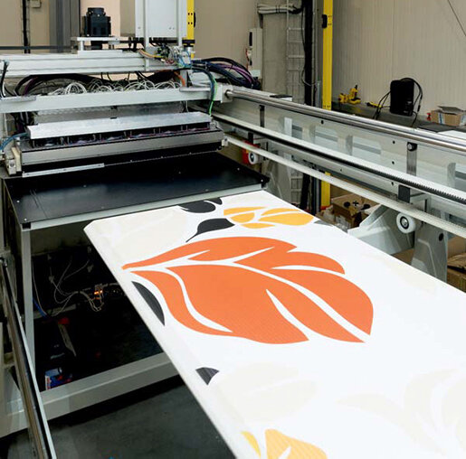 Subsequently the final digital print is varnished by a matt PUR lacquer. The resulting surface offers so a high resistance both against UV light rays and against scratching and abrasion.