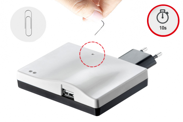 With the help of a paperclip, press the RESET button for about 10 seconds.